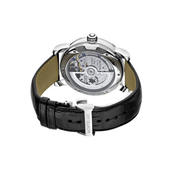 43 mm watch with stainless steel case, Montblanc Calibre MB R200, monopusher chronograph with automatic winding, anthracite-coloured dial with applique hour circle, date display, second time zone with day/night display, chronograph counters with rotating discs.